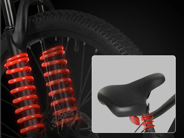 Featuring a front fork suspension and an ergonomically designed seat, this bike effectively reduces bumps and vibrations from uneven roads, providing a noticeably smoother and more comfortable riding experience.