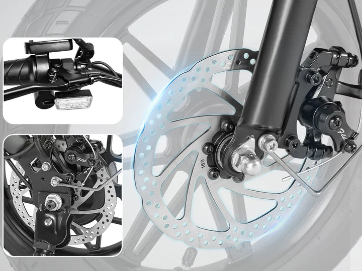 Equipped with dual LED headlights and taillights, the bike enhances visibility and safety in both daytime and nighttime conditions. These powerful lights ensure clear illumination for night rides while providing reliable visibility during routine checks and daily use.Reliable Mechanical Disc Brakes