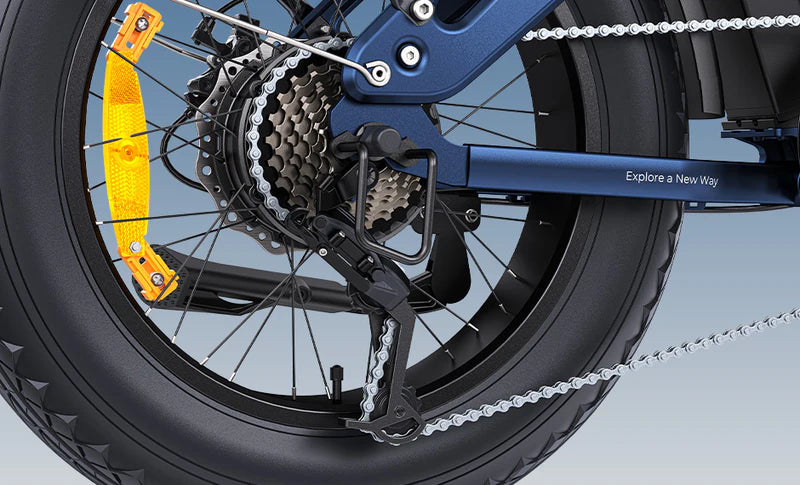 These rugged fat tires deliver excellent traction and cushioning, ensuring a smooth, controlled ride whether you're navigating city roads, sandy paths, or snowy terrain